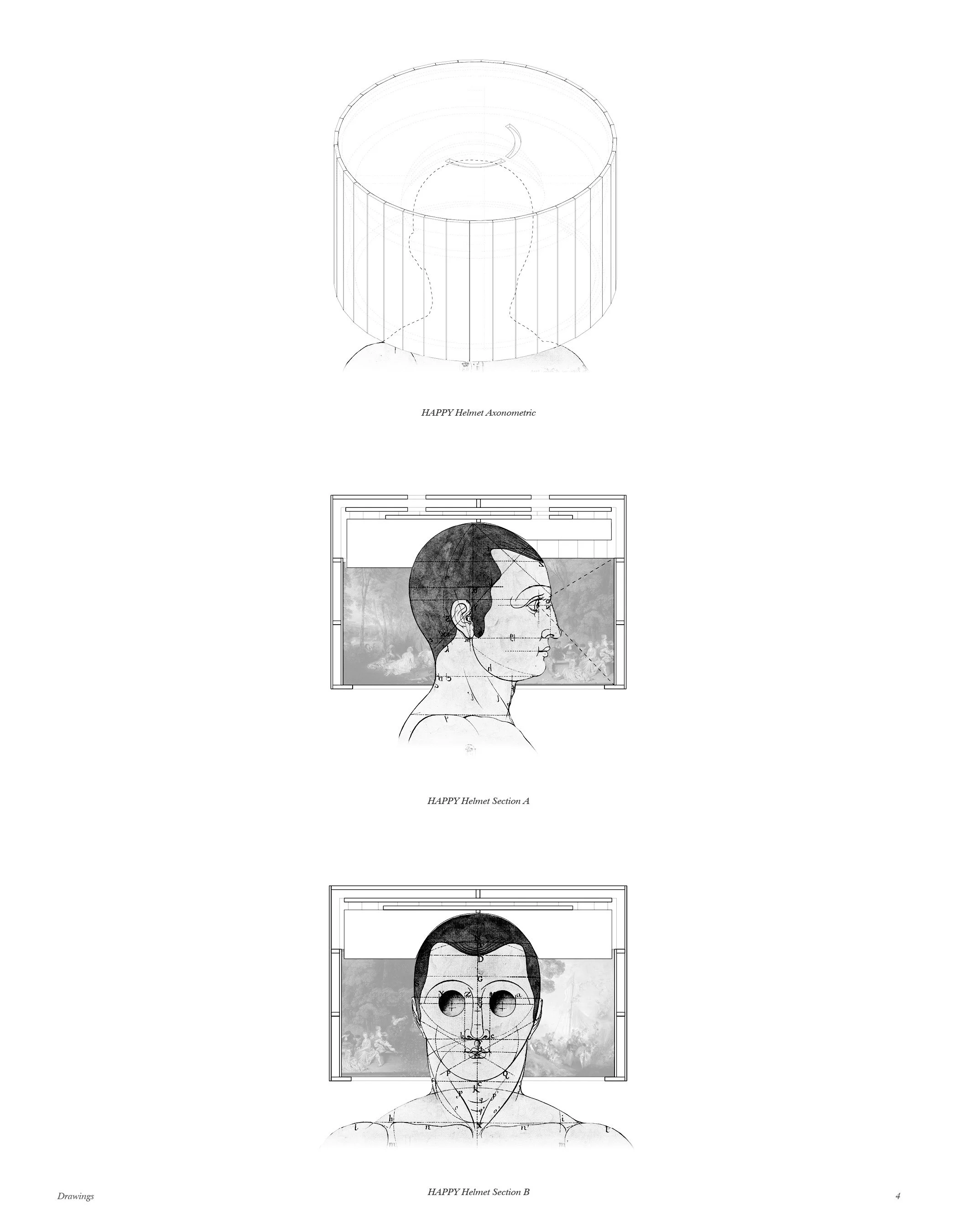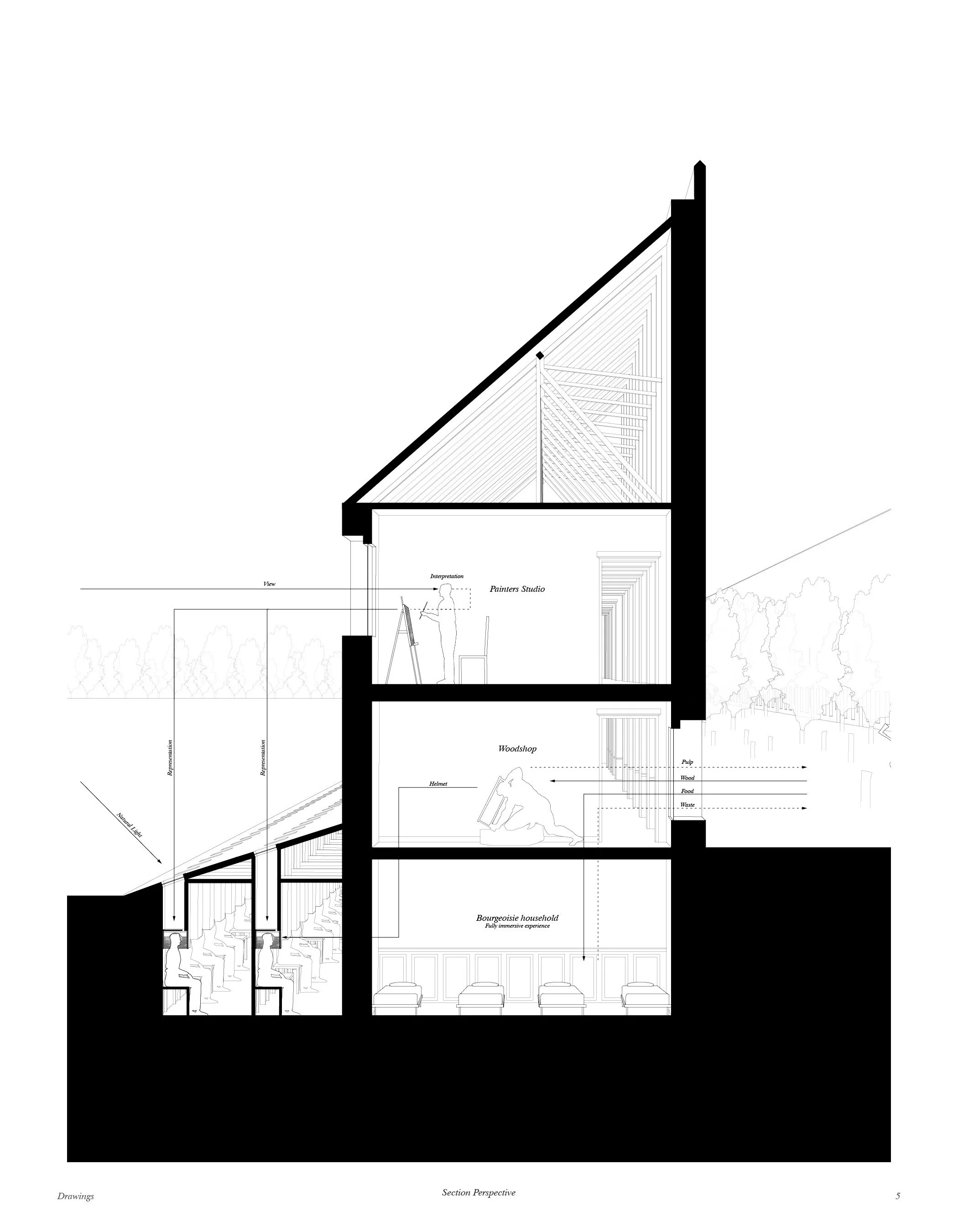 Beyond the personal immersion, this device is expanded into a collective architectural scale. Imagine a three-floor building. The helmet is worn in the basement, a below ground bourgeoisie household which creates a fully immersive experience. Light, temperature, and sound are all moderated by the mass of the earth. On the ground floor, a carpenter collects resources from a courtyard to build the helmets. The carpenter does not experience the outside world, but has a hands-on connection with nature, a physical relationship with something real. On the floor above, a landscape architect sees the world from a distance through a window. Here, the exterior is replicated in a representation, but not experienced. Their paintings of the outside create the virtual world for the helmet. As this layered architectural machine expands with new users, the world outside transforms into a land of production in order to sustain the users of the virtual world.