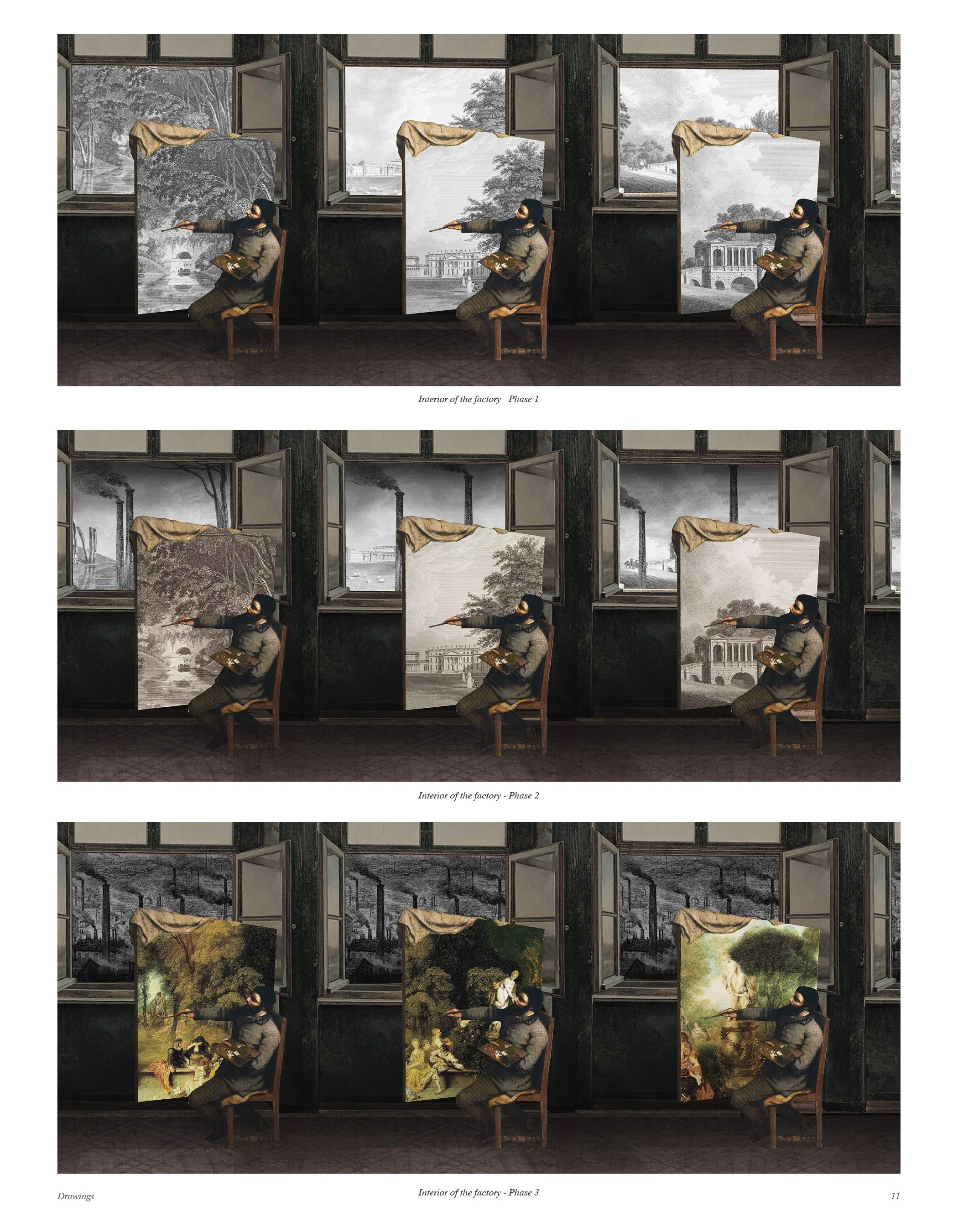 The ideal setting to deploy this device is Stowe Park in Buckinghamshire, England, which was described by Pope as a perfectly picturesque landscape. We would then expect no difference at Stowe between image and reality. The virtual and physical would begin as equals, only to diverge over time. The virtual landscapes are free to improve, as the paintings loose connection from reality, based instead on the memories of the designers. These landscape architects are free. Their agency as no limits, as the images they create are a reality and the only experienced world of those immersed in the virtual. The physical need only exist to provide the resources to sustain the architectural device. This project illustrates the degradation of the physical world which corresponds to improvements in virtual landscapes.